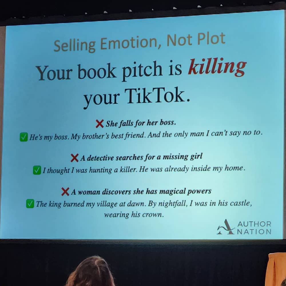 I will leave you with this picture of a slide I took during a lecture on TikTok on how to pitch your book on socials. Why did I go to a social media lecture when I have no social media (except Pinterest)? Because I am always looking to learn about this business and share what I learn with you.